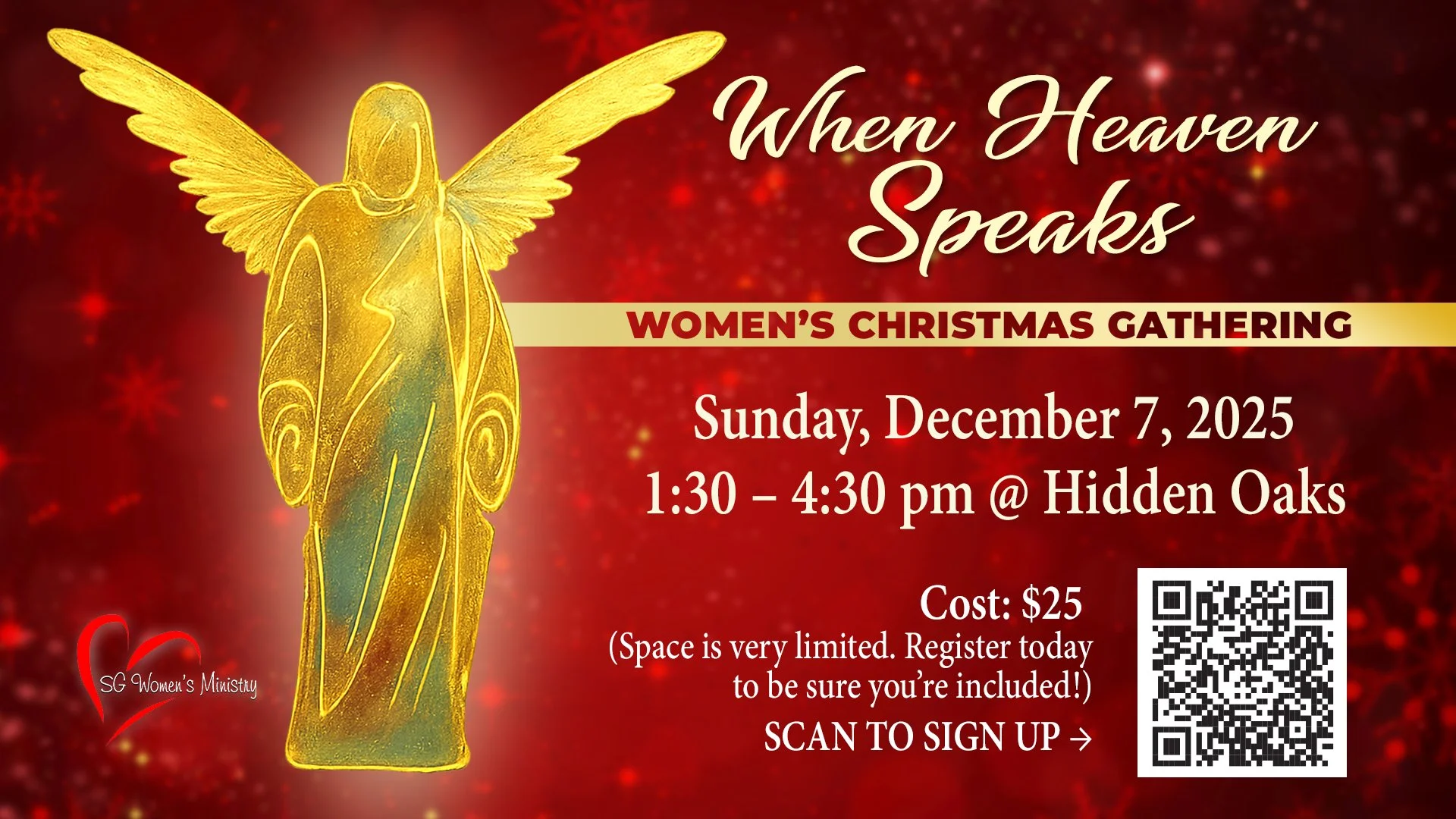 Celebrate the joy of God’s voice in your life. When Heaven Speaks is a joyful celebration created just for women. Together we’ll enter the wonder of the Christmas story, where angels carried messages of hope that changed the world forever. Just as God spoke then, He still whispers encouragement, guidance, and protection into our lives today—often through the “angels on earth” who walk beside us. Come be refreshed, inspired, and surrounded by the beauty of women gathering to listen for heaven’s voice. You’ll leave uplifted, reminded that God still speaks, listens, and cares.